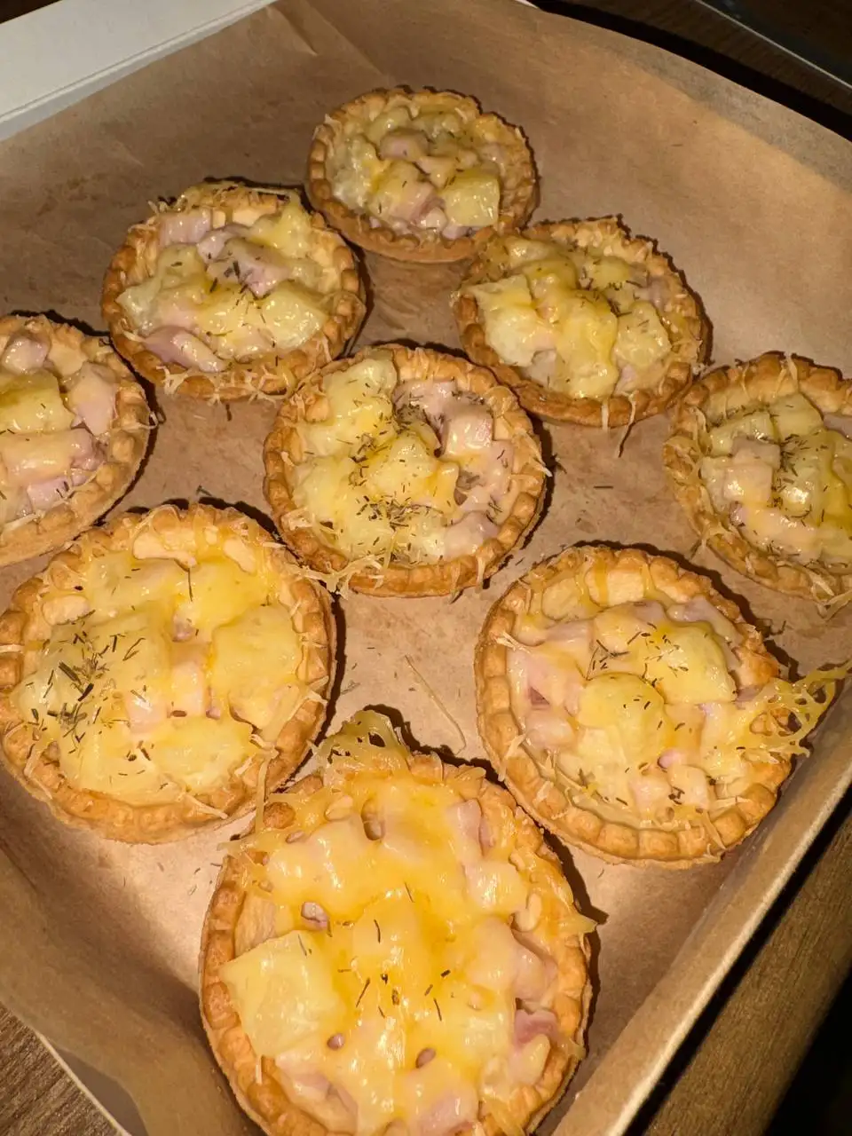 Песочные тарталетки, ананас, ветчина, майонез, сыр