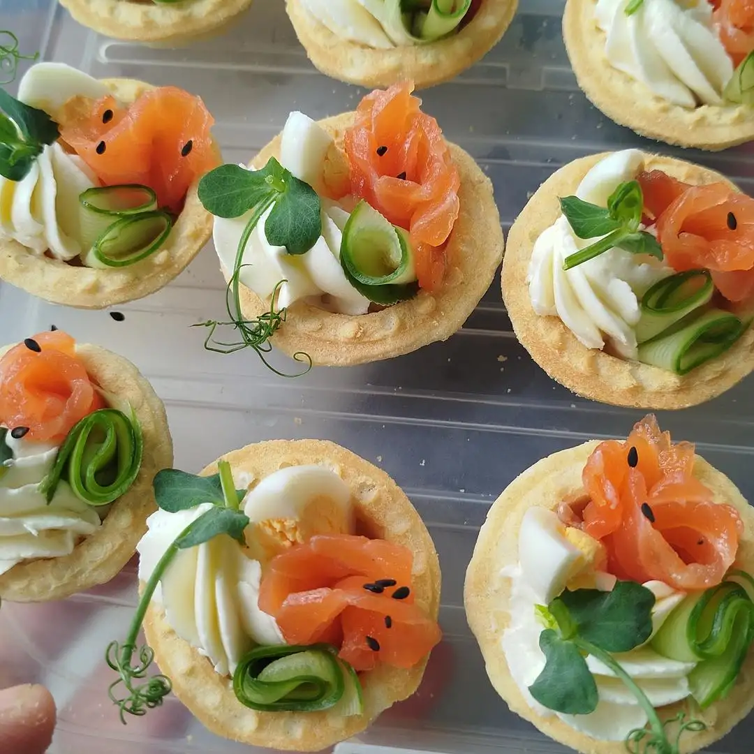 Песочная корзинка с форелью, огурцом и творожным сыром