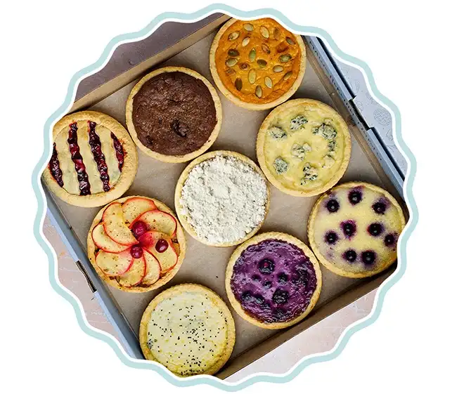Ассорти из сладких тарталеток для долгого удовольствия. В набор входят: 1. Французский пирог с грушей и сыром Дор блю; 2. Лондонский с ароматной запеченной тыквой и абрикосом; 3. Польский пирог с маком и творожным сыром; 4. Английский крамбл с томленым яблоком и брусникой; 5. Датский пай с натуральной вишней; 6. Румынский пирог с творогом и черной смородиной; 7. Шоколадный Чикагский брауни с брусникой и грецким орехом; 8. Финский пирог с натуральной лесной черникой; 9. Австрийский штрудель с яблоками, изюмом, грецкими орехами и корицей. 9 тарталеток — диаметр 10 см — 1250 г