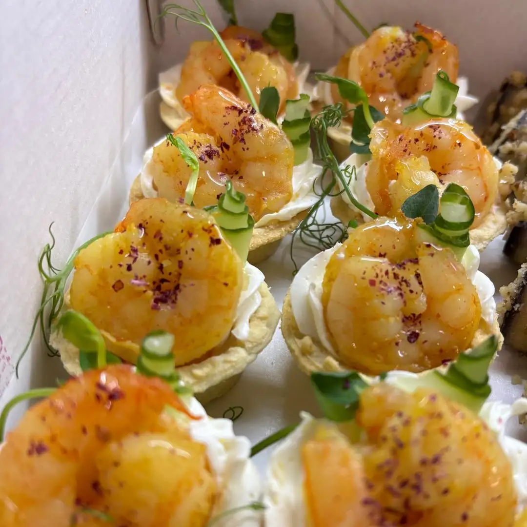 Тарталетка с креветкой Тарталетка с красной рыбой Тарталетка с мидиями Тарталетка с запеченные с курицей и грибами) Минимальный заказ — 10 шт.