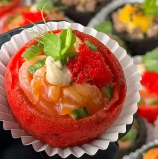 Тарталетти с сыром с голубой плесенью и финиками Тарталетти с креветкой и икрой тобико Тарталетти с форелью и икрой тобико Заказ от 12 штучек.