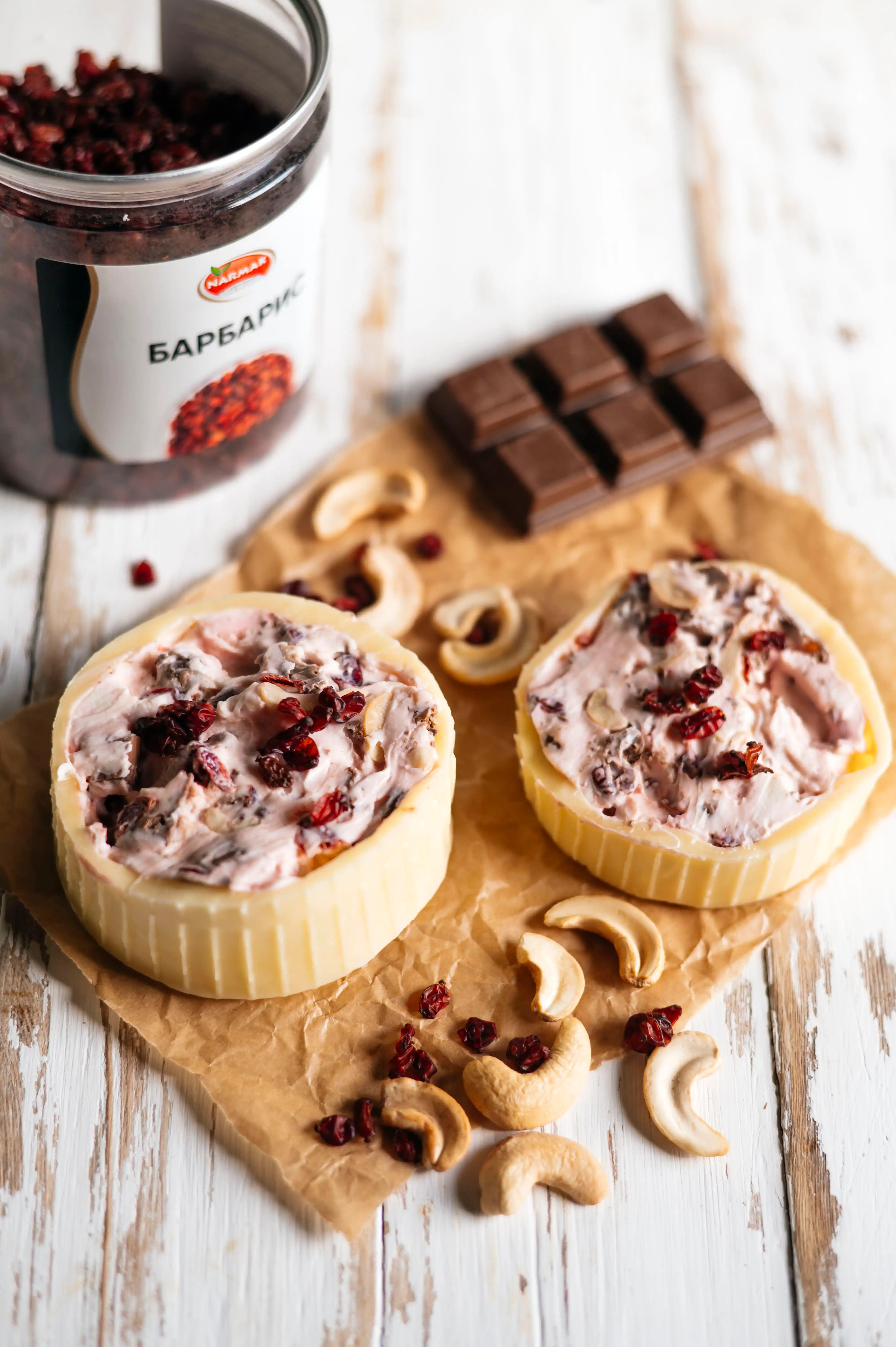 Барбарис вяленый+шоколад+кешью. Пикантный, слегка кисловатый вкус барбариса, дополняется сладостью шоколада. Кешью смягчает вкус 250г/шт
