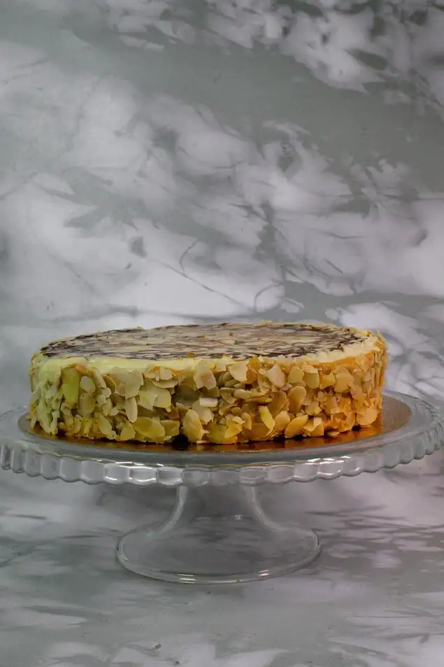 Воздушно-ореховые коржи, с добавлением грецкого ореха, пропитанные кремом на основе сливочного масла и варёной сгущёнки, покрытые белым шоколадом.