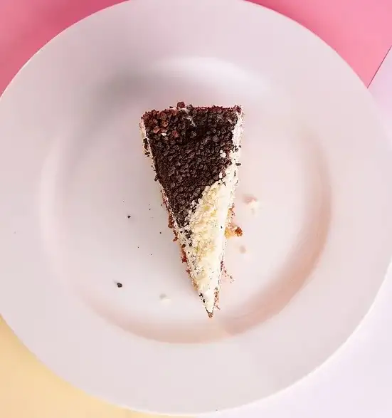 Чередование белых и шоколадных бисквитов, сметана, сливочный крем и шоколадная посыпка.