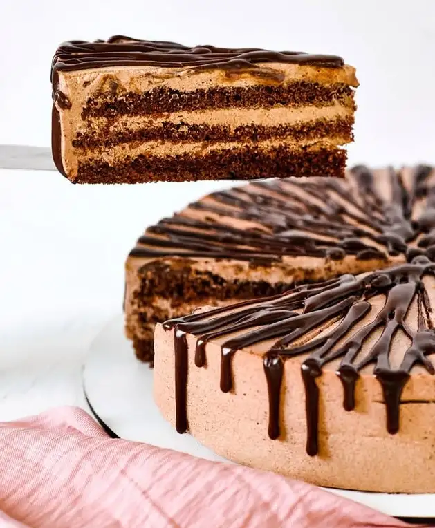 Пористый шоколадный бисквит, сливочный шоколадный крем и мягкая шоколадная глазурь.
