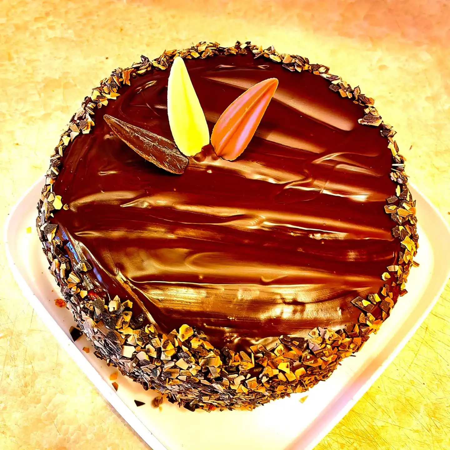 Шоколадный бисквит пропитанный сиропом с хорошим коньяком, шоколадный крем с абрикосовым кремом, сверху два слоя шоколадной глазурию Заказ от 2 кг.