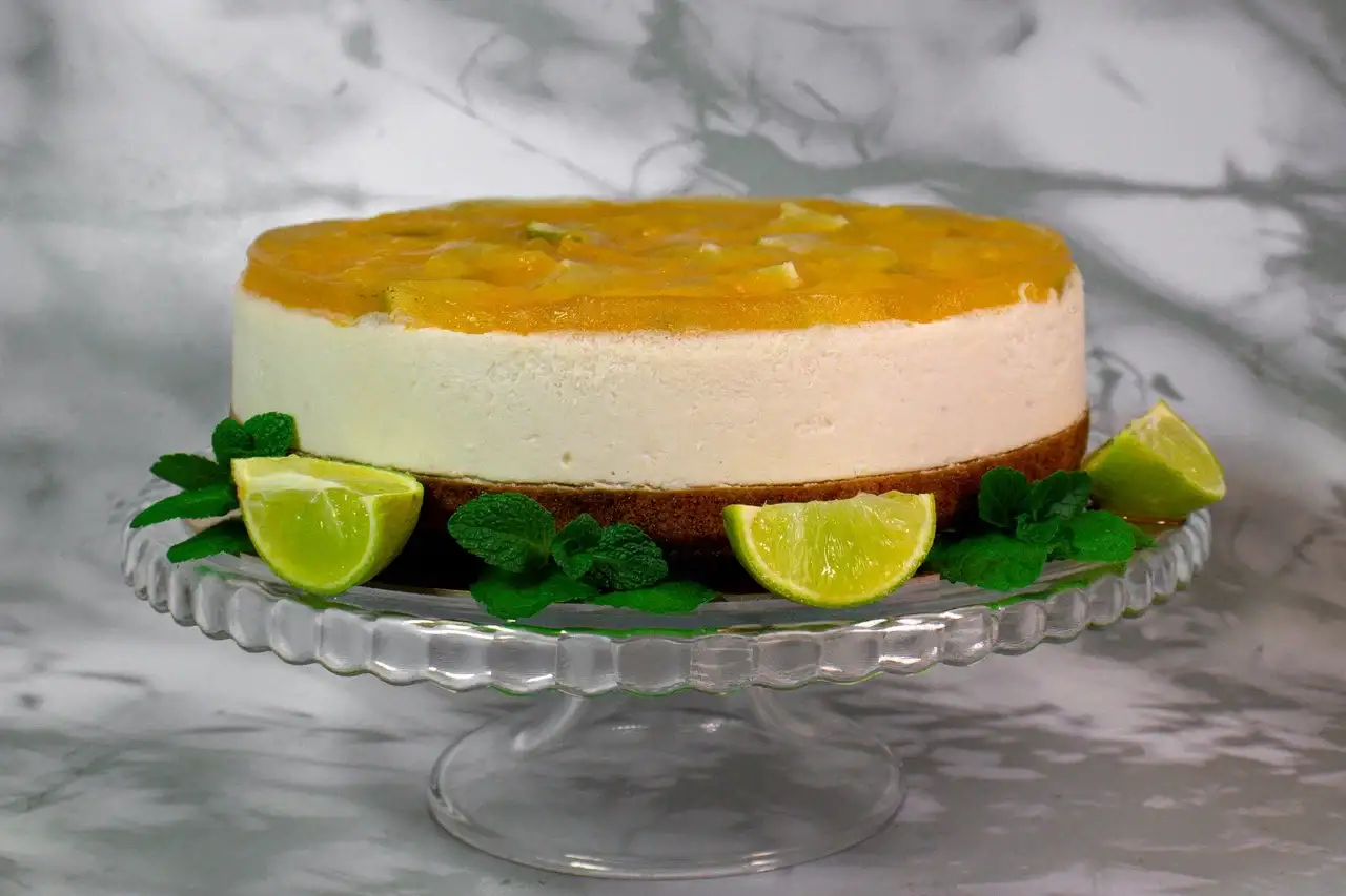 Нежный кокосовый мусс на основе кокосовых сливок и орехов кешью, украшенный сверху желе из манго и лайма, на основе бисквита из безглютеновой муки.