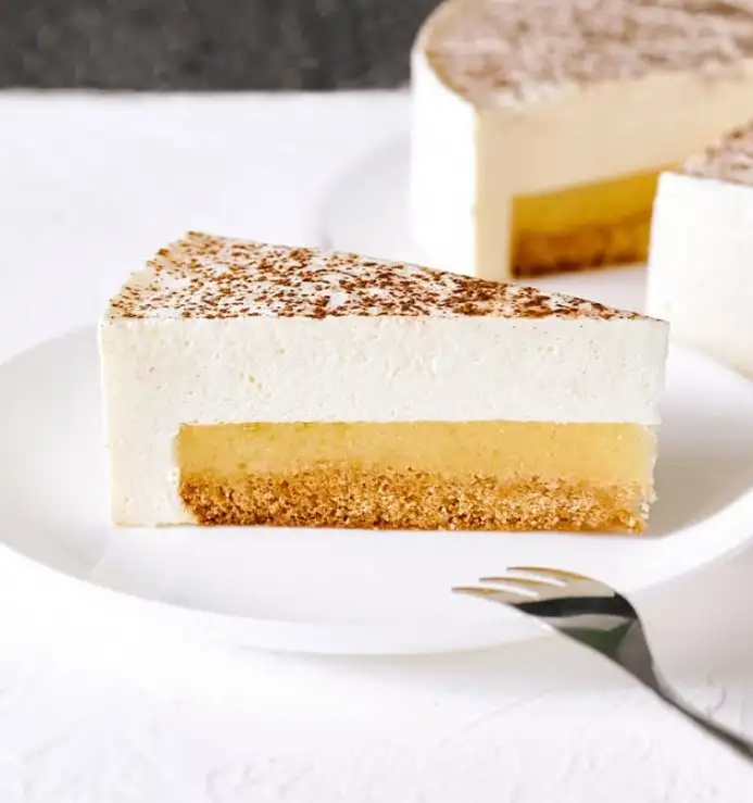 Сливочный бисквит с корицей, компоте из яблок и нежный мусс-пломбир на белом шоколаде.
