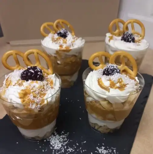 Нежный десерт с бананом, вареной сгущенкой, взбитыми сливками и сливочным печеньем. Заказ от 4 штук 1 шт. — 220 гр
