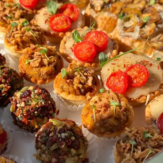 Брускетта с грибами на картофельно трюфельном муссе — 5 шт Тарталетки с грибным риетом — 8 шт Жюльен а-ля Карбонара с трюфелем — 5 шт Сырный трюфель с пармезаном,вялеными томатами и зеленью — 8 шт Чизболл десертный с вишней,клюквой и курагой — 8 шт