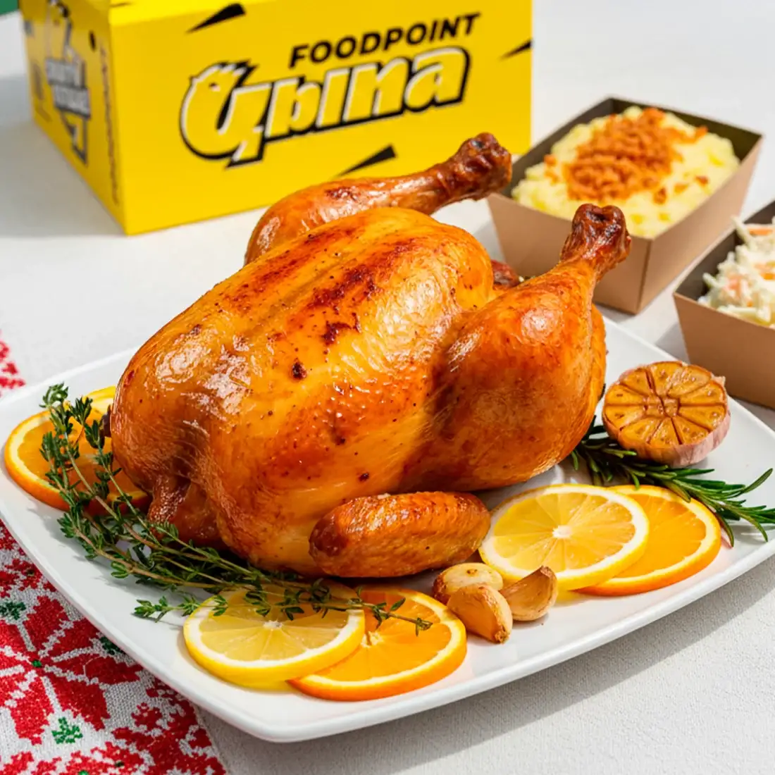 Целая цыпа «Хатняя» (1400–1700 г) + салат коул слоу (150 г) + толченый картофель (150 г). Подаётся с фирменной заправкой для гарнира. Вес готовой цыпы от 1400 до 1700 г. Приготовлена по домашнему, но по многоэтапной технологии, которая даёт глубокий, ровный вкус и сочность. Сначала цыпа проходит соленад — он обеспечивает сочность и подготавливает мясо к дальнейшему маринованию. Затем внутрь кладём апельсин, лимон, чеснок, аджику, тимьян и розмарин: цитрус, свежие травы и лёгкая пряность формируют основу будущего вкуса. После маринования цыпа проходит длительное приготовление по технологии Sous Vide — соки сохраняются внутри, а вкус становится глубже. Финальное запекание даёт ароматную корочку и завершает вкус.