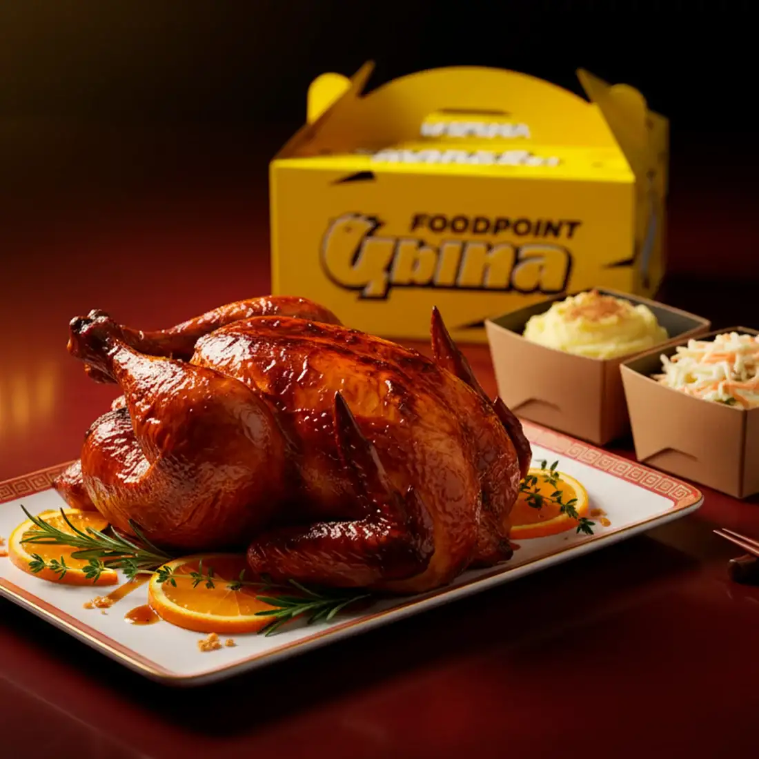 Целая цыпа «Пекин» (от 1300 г) + салат коул слоу (150 г) + толченый картофель (150 г). В бокс к цыпе идёт фирменный соус «Пекин» Готовим из отборных крупных цыплят по технологии пекинской утки. Проходит соленад, маринуется в премиальных азиатских специях с добавлением свежих трав и фруктов. Окунается в кипящий бульон, вялится и покрывается глазурью. Три дня и цыпа готова: сочная, с плотной тёмной кожей и глубоким вкусом.