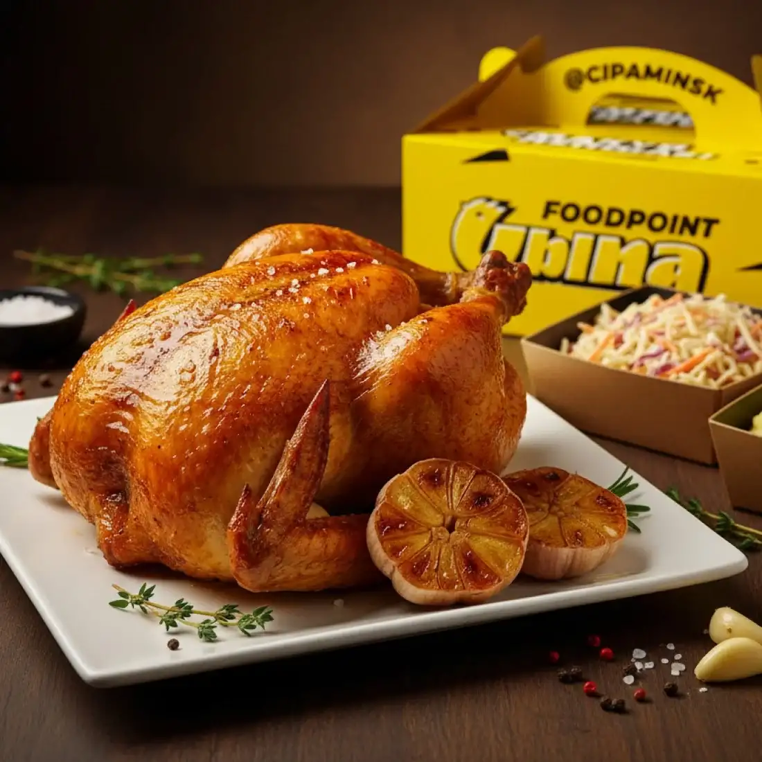 Целая цыпа «Хатняя» (1400–1700 г) + салат коул слоу (150 г) + толченый картофель (150 г). Цыпа, приготовленная по технологии соляного вяления — способ, который усиливает вкус и подчёркивает сочность. Сначала охлажденная тушка проходит соленад, раскрывающий сочность и подготавливающий мясо к следующему этапу. Затем цыпу покрывают смесью соли, чеснока, перца и свежих трав и оставляют на медленное вяление — в этот период вкус становится насыщеннее, аромат глубже, а текстура плотнее. Перед запеканием цыпу покрываем лёгкой глазурью, чтобы подчеркнуть вкус и сформировать плотную золотистую корочку. Запекание завершает процесс: мясо остаётся сочным, а корочка приобретает выразительный насыщенный вкус.
