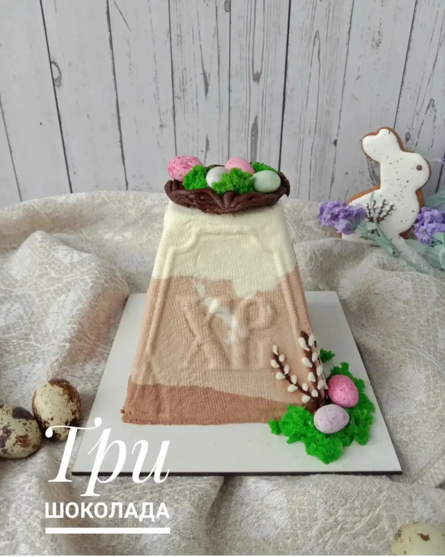 Трёхслойная Пасха с выраженным шоколадным вкусом на основе белого, молочного и темного шоколада. Вес 900 грамм.