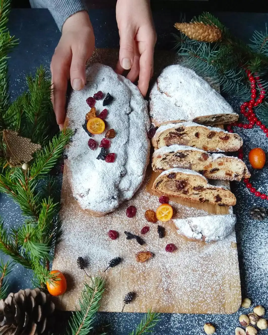 Праздничное оформление в пакете. Вкус штоллена зависит от качества продуктов! Поэтому я выбираю только лучшее: два вида изюма,ароматную курагу сорта «лимонка» и насыщенную «шоколадную», вяленую сливу и клюкву. Чтобы создать тот самый, согревающий аромат, я смешиваю цейлонскую корицу, ваниль, бадьян, гвоздику, имбирь, мускатный орех и.... щепотку волшебства) Всю эту роскошную фруктовую смесь я пропитываю ромом Baccardi и соками цитрусовых. Чтобы я успела подготовить все ингредиенты и выпечь ваш штоллен, заказы принимаю до 22 декабря. Получить свой штоллен вы сможете с 23 декабря по 19 января.
