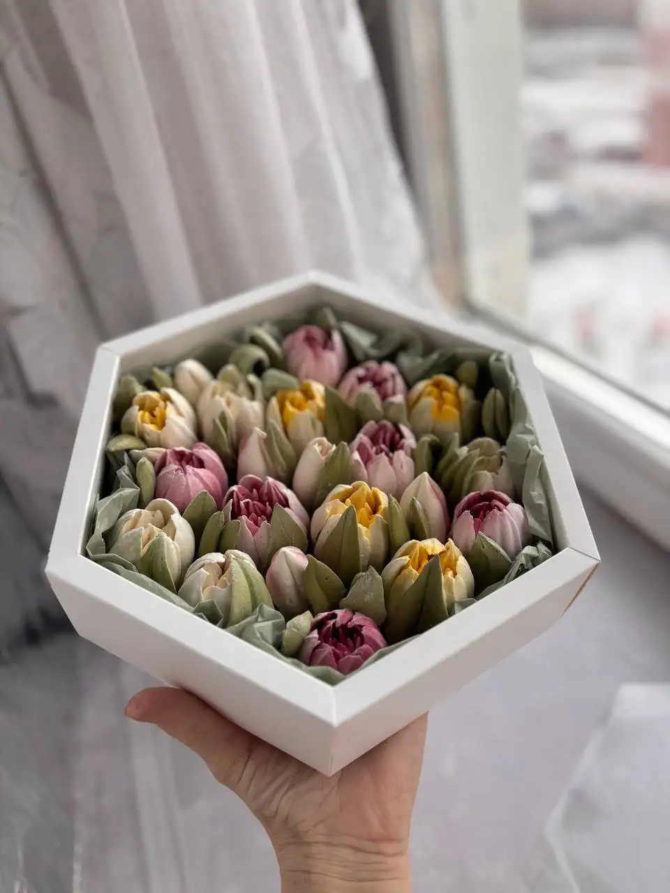 Коробочка зефирных тюльпанов сделана на яблочном пюре. Компактная , красивая подача зефира в виде самых весенних цветов. Подарок маме, учителю, девочке, дочке, девушке, бабушке.