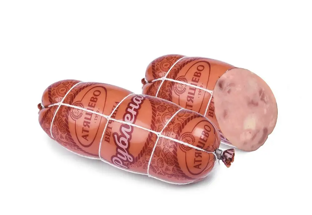 Состав: свинина, филе грудки цыплят-бройлеров, вода питьевая, шкурка свиная, крахмал картофельный, посолочно-нитритная смесь (соль, фиксатор окраски (нитрит натрия)), экстракт черного перца, чеснок, регуляторы кислотности (пирофосфаты, ацетат натрия), загуститель (каррагинан из водорослей EUCHEUMA), краситель (кармины).
