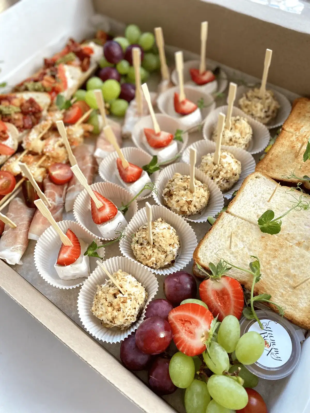 Cостав: Брускетта с вялеными томатами и фетой (6 шт) Салат «Капрезе» на шпашке Канапе с сыром Бри и виноградом (6 шт) Сзндвичи с лососем и авокадо (4 половинки) Королевские креветки в азиатском соусе (6 шт) Виноград / Мед / Черри Сет на компанию из 3-4 человек Вес: 1650 г