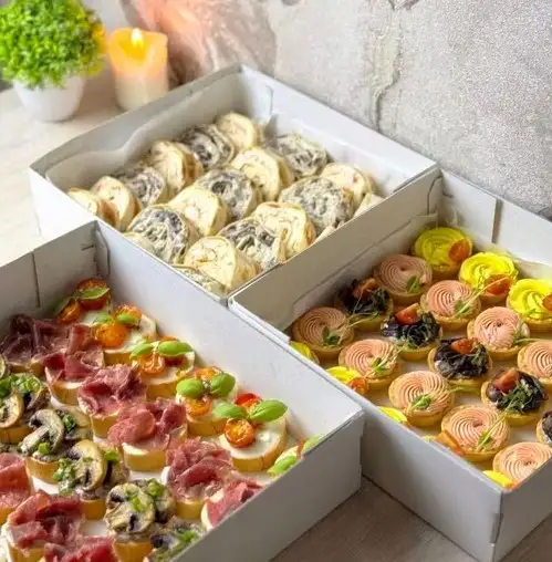 Бокс рулетиков микс (грибы, курица с корейской морковью, с тунцом) Бокс тарталеток (сырно-яичный мусс, крабовый паштет, грибной мусс) Бокс кростини (печеные черри, мяско сыровяленное, шампиньоны)