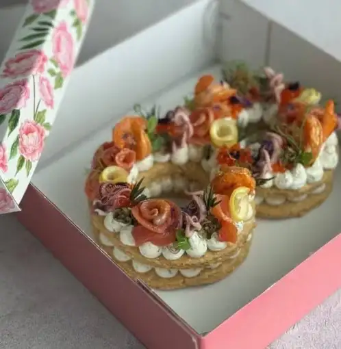 Вес готовой цифры ~1800 гр, размер 26 см Основа — песочное тесто, начинка — форель с креветками, крем — творожный сыр с травами и чесноком, рыбный декор. *оформление декора может отличаться