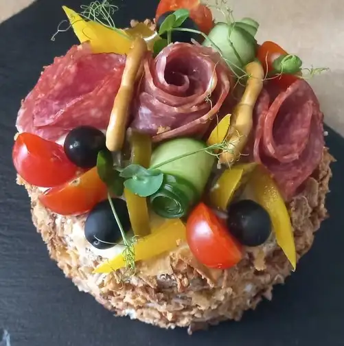 На выбор: — «Фиш»: шпинатный бисквит, пропитанный сливками и кремчизом с начинкой из слабосоленой форели. — «Тоскана»: бисквит с добавлением красного болгарского перца, пропитанный сливками и уникальным кремом на основе томатного песто с начинкой из мясного фарша и копченого бекона.