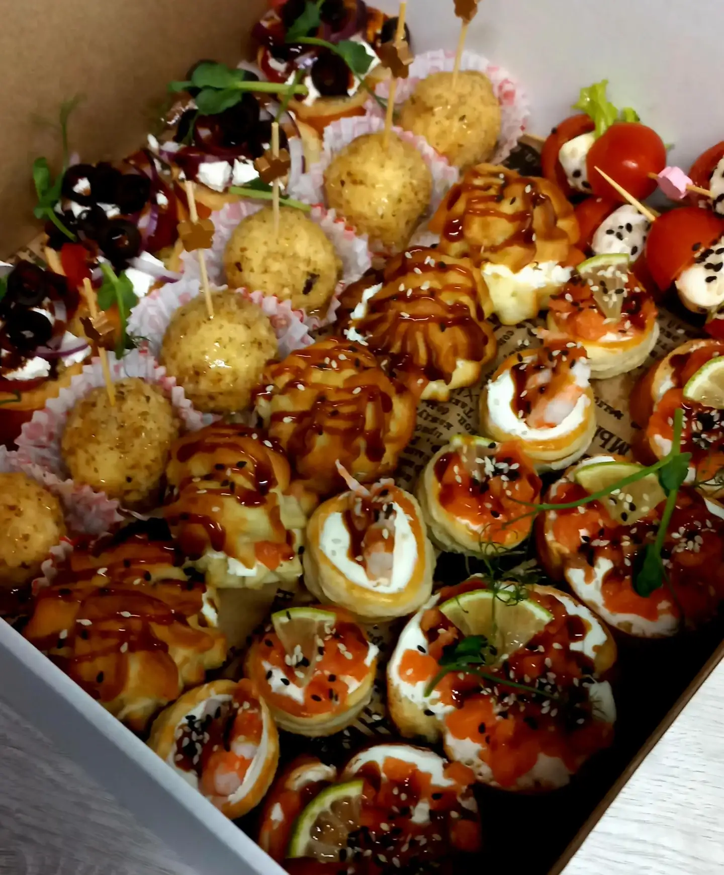 Валован с креветкой, 3 шт. Валован с лососем, 3 шт. Брускетта «Греческая», 4 шт. Брускетта «Лосось», 4 шт. Шпажка «Черри-моцарелла», 6 шт. Профитроль «Лосось», 5 шт. Сырные шарики, 6 шт.