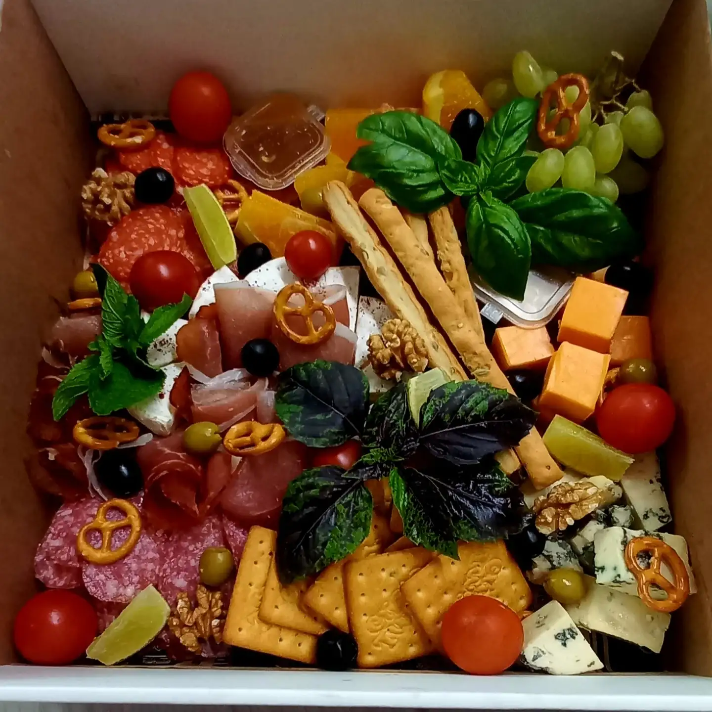 Камамбер Чеддер Дор Блю Пепперони Ветчина пармская Салями Апельсин/лайм Виноград Оливки/маслины Мед