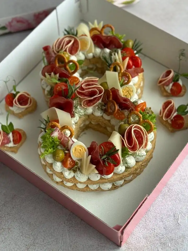 Песочное тесто, начинка из филе с шампиньонами, декор из мясных копченостей.